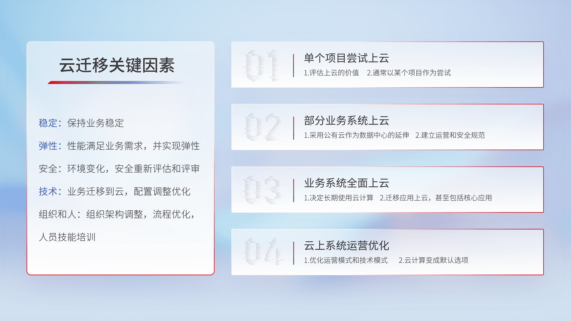 结合实际业务,,从规划设计、、云平台选型、、、、云原生改造、、、、数据迁移、、、集成交付,,,,迁移全过程为客户识别最佳上云路径,,做好风险识别管理,,,设计网络架构、、身份权限、、、、安全审计合规、、、、操作审计、、、日志审计、、、、监控告警策略、、、、多站点容灾设计等,,对云上基础设施进行整体规划,,,提升IT治理水平,,以满足弹性、、、、高可用、、、高性能的需求。。
