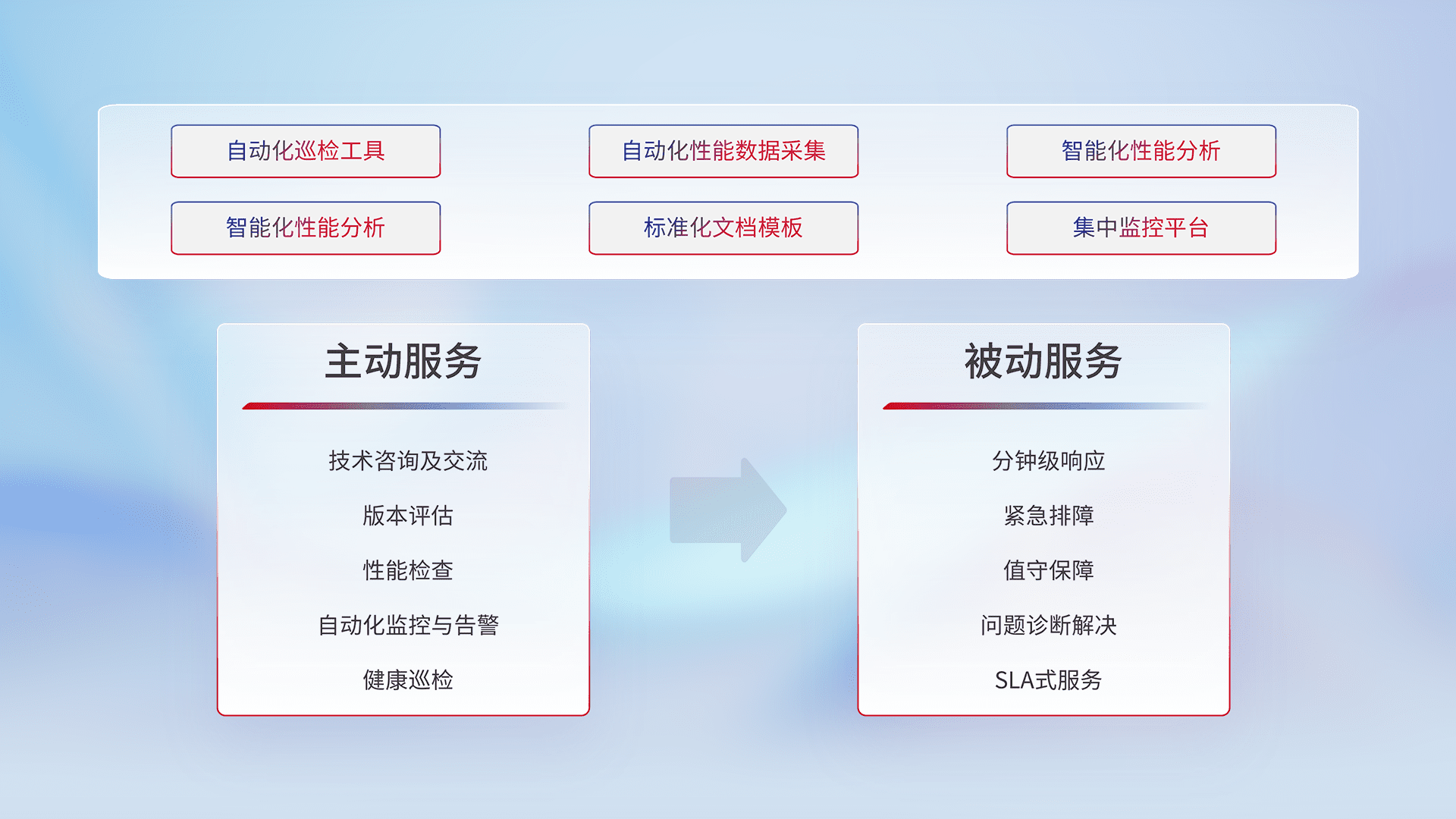 智能化工具和标准化文档,,,,保障服务质量,,,提供主动服务(包含技术咨询、、、版本评估、、、性能检查、、、自动化监控与告警、、健康巡检)和被动服务包含(分钟级响应、、紧急排障、、、、值守保障、、问题诊断解决、、、、SLA服务)。。